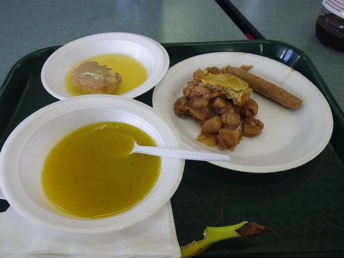 Kirktonでの食事。スープにミートパイ、ソーセージ。