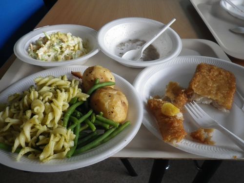 私はココで寝るので、しっかり食べちゃいます。パスタにポテト、サラダ、マッシュルームのスープ、フィッシュ。