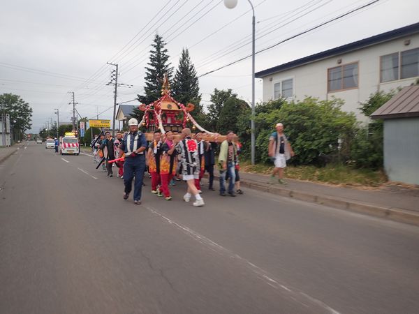 PC5 別海町民体育館の手前交差点で夏祭りやっていた。山車が来た。
