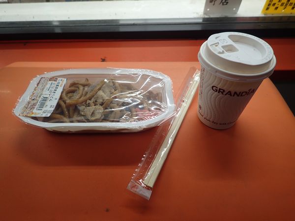 セイコーマートで100円焼うどんにコーヒーで気合を入れる。