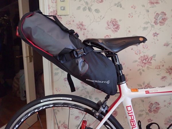 サドル後方へ、けっこうせり出す形となる。しっかりとストラップを引いても、がっちりと固定はできないようだ。ダンシングすると振られるようだ。