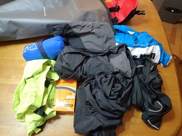 アンダーウェア、ジャージ、長パンツ、レインジャケット、輪行袋、予備チューブ1本となっている。