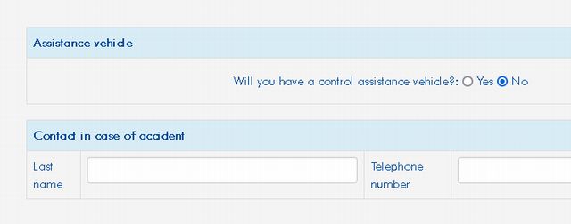 Assistance vehicleは普通の人はいらないはずなのでNo選択。その下は事故の時の連絡先を入力する。