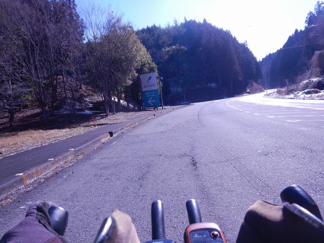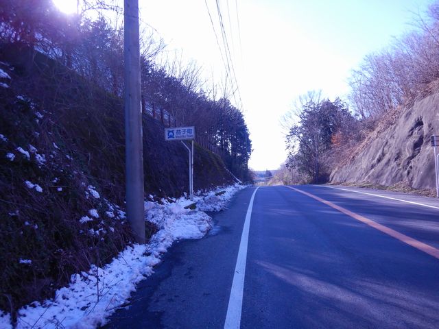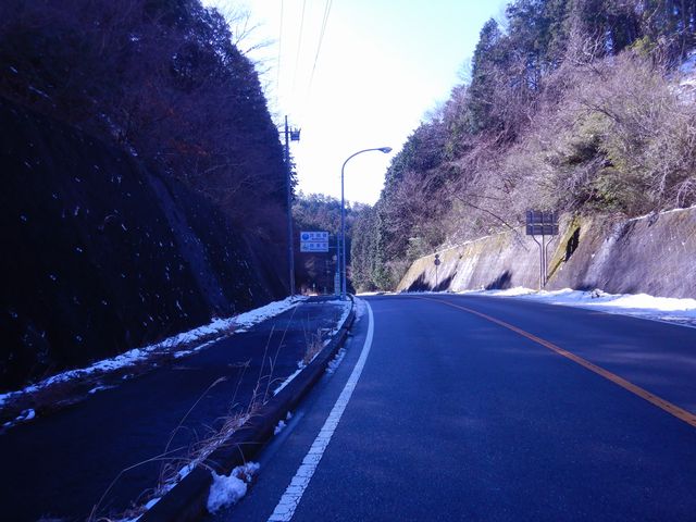 道端には昨日の残雪が残っている。道路はドライで問題なし。でも寒い。