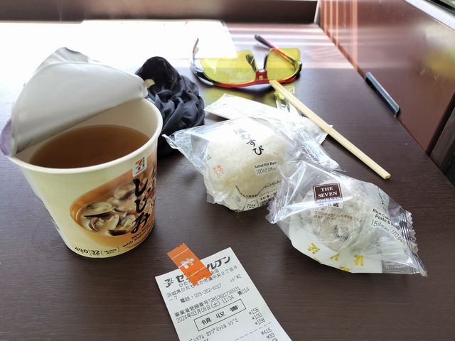 しじみ汁に塩むすびを投入して流し込む。あとは大福。イートインは消費税10%です。