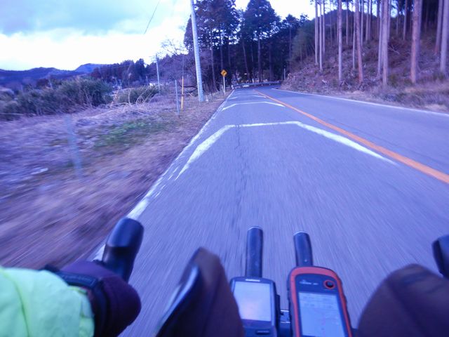 復路の最高標高を通過。とんでもない風だが、けっこう周りが遮られているので、あまり向かい風を感じずにすんだ。しかし峠を超えて視界がひらけると、また暴風が・・・