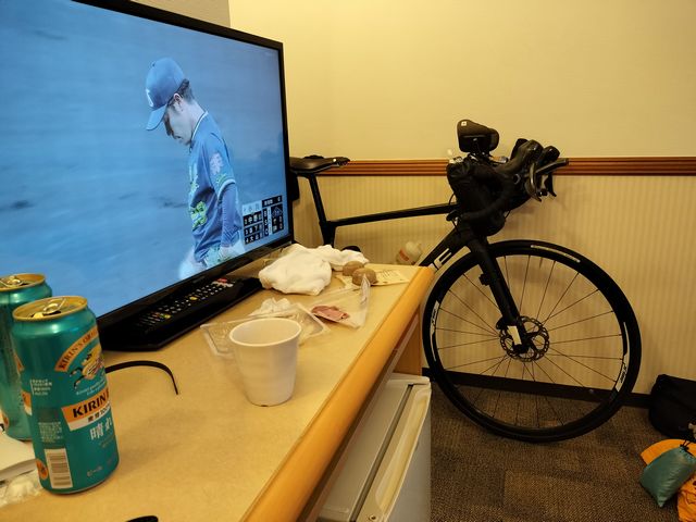 ビールでものみながらバイクを組み立てる。電車輪行はタイヤのエアを抜く必要がないのがいいかも。すべての機材の充電も終わっているので、スマホだけケアすればOK。