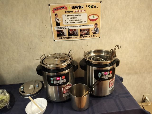 ホテルフロントにお夜食うどんがあった。すぐにいただいた。マジでうまかった。