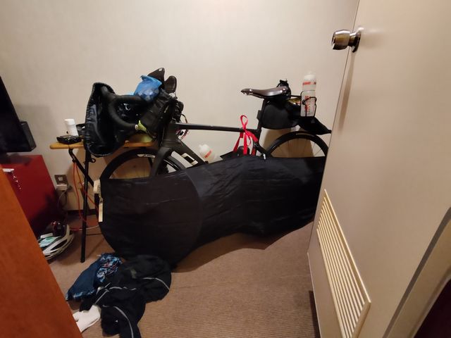 DHバーを付けているので、DHポジションによる首の痛みを懸念してロキソニンテープを8枚(2枚×日数分)持ってきているので、首とふくらはぎに貼っておく。