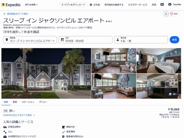 ジャクソンビル空港近くの「スリープイン ジャクソンビルエアポート」を「エクスペディア」で予約した。