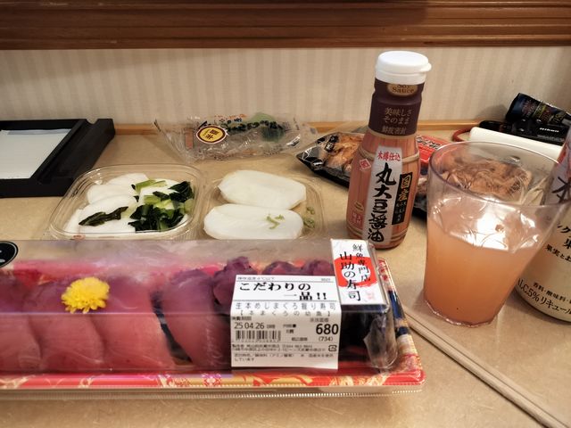 ホテル前にあるはま寿司にテイクアウトを聞いたら1時間と言われたので、あきらめてコンビニへ。