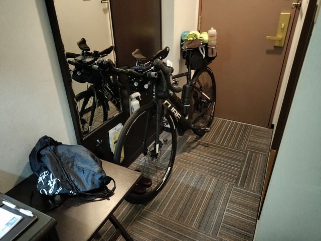 部屋に自転車持ち込みOK。そっこーで着替えてランドリーに突っ込み風呂に入る。風呂を出て乾燥機に放り込んで一段落。