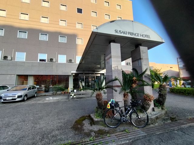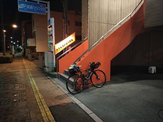 ホテルは自転車持ち込みOKでした。明日は須崎まで240kmくらい。フェリーもないので気は楽だが、次の日の八幡浜まで遠いので、できるだけ明日の須崎へは早めに到着をしたい