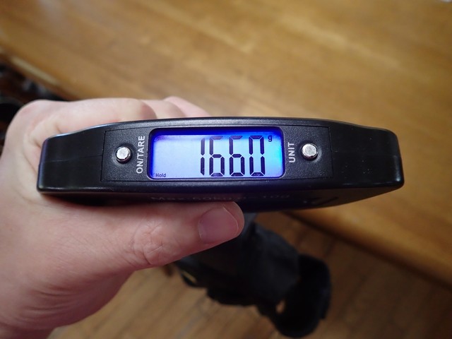 ブルベ・ロードバイクアイテムが詰まった状態で重量を測ってみると1.66kgという重量になった。けっこう重いな・・・