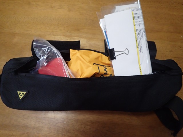 それでは、トピークミッドローダーフレームバッグに入っていた、ブルベ・ロードバイクアイテムをすべて取り出してみよう。このくらいのアイテム容量であれば、フレームバッグはほとんど膨らまず、ペダリングの足や膝にフレームバッグが当たることはほとんどない。