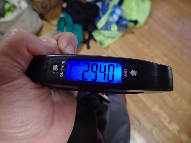 ただ、ここに補給食(アミノバイタルゼリー200g、ジェル×2本100g)300g分は途中で補給として使ってしまった。なので、トータルは約2kgとなる。