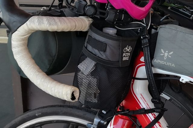 ブルベやロングライド走る時、ハンドルポーチはかなり便利と思う。これを左右に2つ付けている。右側には柿の種入れたボトルとモバイルバッテリー。