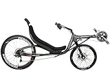 長い一本フレームの上のサドルの代わりとなる背もたれつきのシートにもたれるように坐り、足を前方に向けた姿勢でペダリングをする自転車です。
