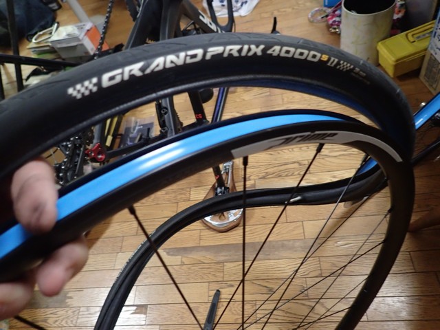 タイヤはコンチGP4000S2ね。ついでに前後のタイヤを入れ替える。リアちょっと減ってきたからね。