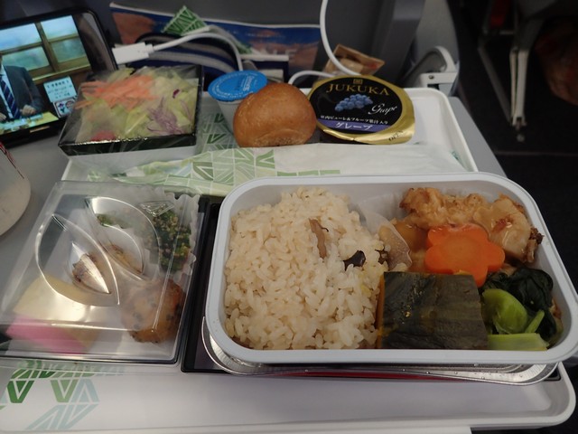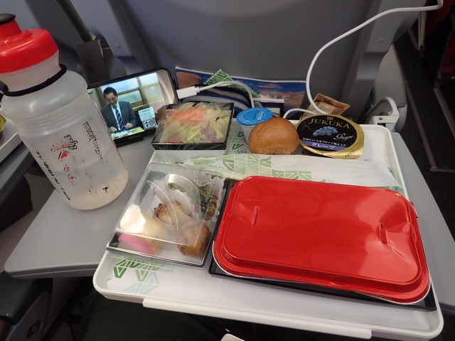 フライトして、しばらくしたら機内食提供が行われた。和食とイタリアンがあったみたいだが、ウチラ後方シートの時にイタリアンは売り切れのようで、和食が提供される。