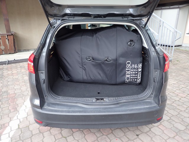 このようにミッドサイズのステーションワゴンならロードバイク輪行袋OS500を横にすっぽり飲み込む。その後ろに余裕でフルサイズスーツケースも入る。後方視界は無いけどな。