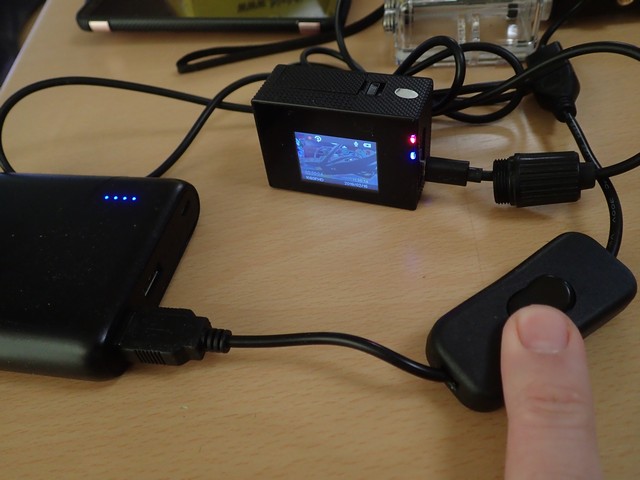 モバイルバッテリーにUSBスイッチを取り付ける。その先にさらにUSBケーブルとアクションカムを取り付ける。