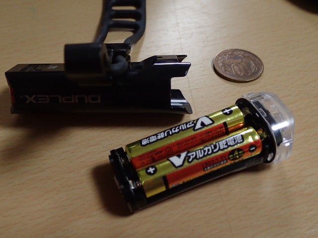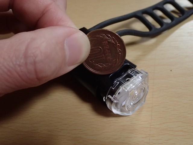 電池交換は手で本体を外すことはできない。フロント部にスリットがありコインでこじるとライト本体が外部カバーからはずれる。