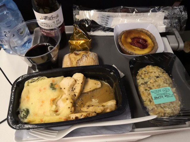 エールフランスの夕食。チキンがおいしい。もう一つのメニューはカレーだった。
