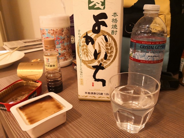 パリ到着、初日の夕飯はバリバリ日本食。サンマの蒲焼、冷奴に麦焼酎水割りw