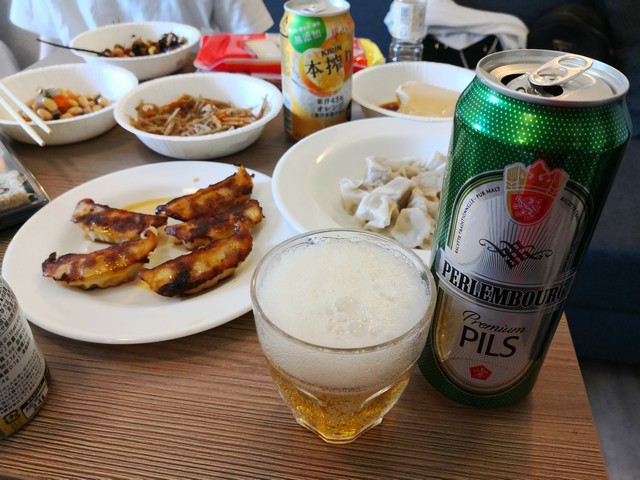 煮豆、ひじき豆、きんぴらごぼう、やっこ、焼売、餃子・・・ビールはフランスのヤツね。