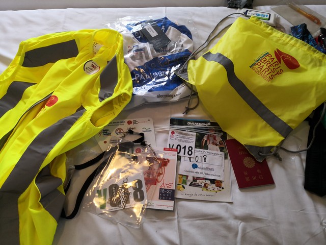 PBPのゼッケン、ブルベカード、ジャージ、リフレクタブルベスト。このベスト袖口キツくなかった?