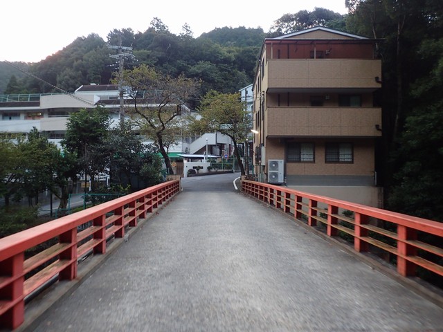 キューシート6番の左折。犬鳴山不動尊本堂の看板、左折し橋を渡る。ここから本格的に葛城山の登り開始。