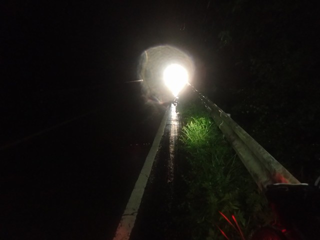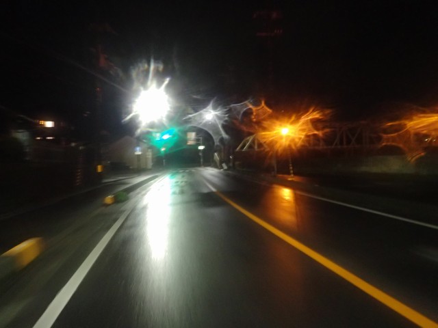 すげー雨ザーザー。スピードでない状態でやっとこ新宮の街明かり。