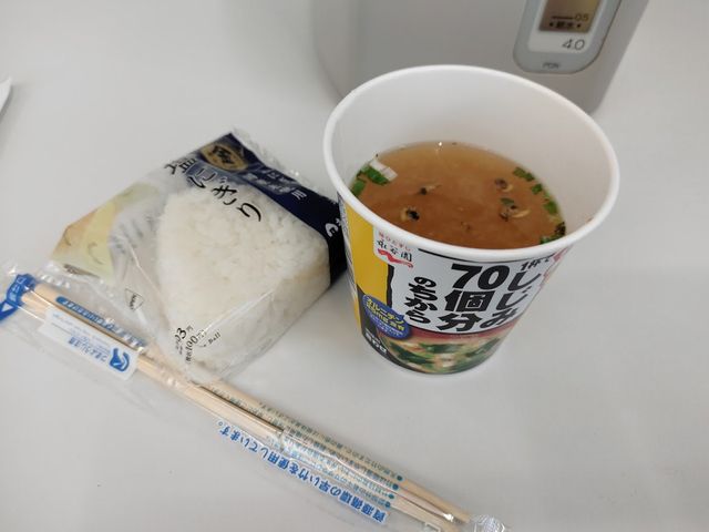 味噌汁におにぎり突っ込んで食べる。ポイントはおにぎりもあたためてもらうこと。そーすると味噌汁が冷めない。