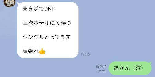 まきば過ぎてちょっとしてからLineチェックするといーんちょーよりDNF連絡がある。あかん。