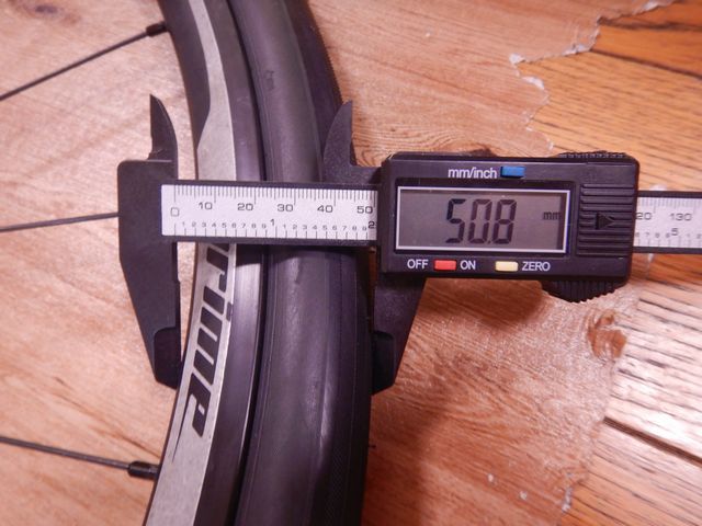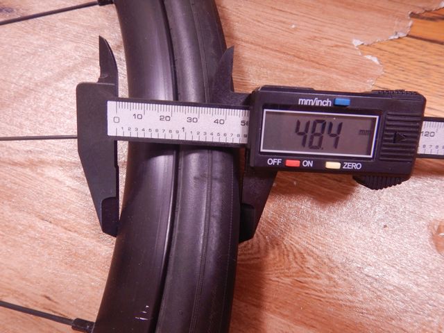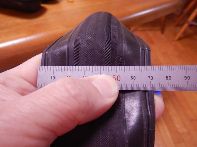 このホイールに履かせた状態で高さは50.8mmだった。前述の28Cでは48.4mmだったので高さは2.4mmとタイヤ径以上に高くなるようだ。